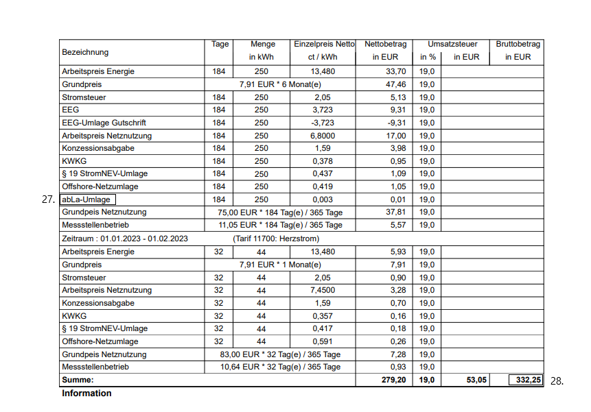 (22) Details zur gesetzlichen Verbrauchsabgrenzung, die auf Grund von Änderungen staatlicher Abgaben, Belastungen, bzw. Steuern etc. erforderlich ist.